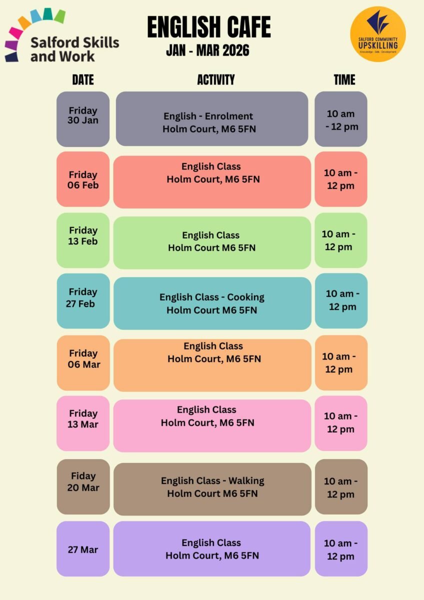 Through the provision of these courses, we aim to offer you the necessary employability skills and the confidence to navigate daily life in the UK. Whether you want to improve your chances of finding work, or simply want to make new friends in Salford, the English Cafe is the perfect place to start.