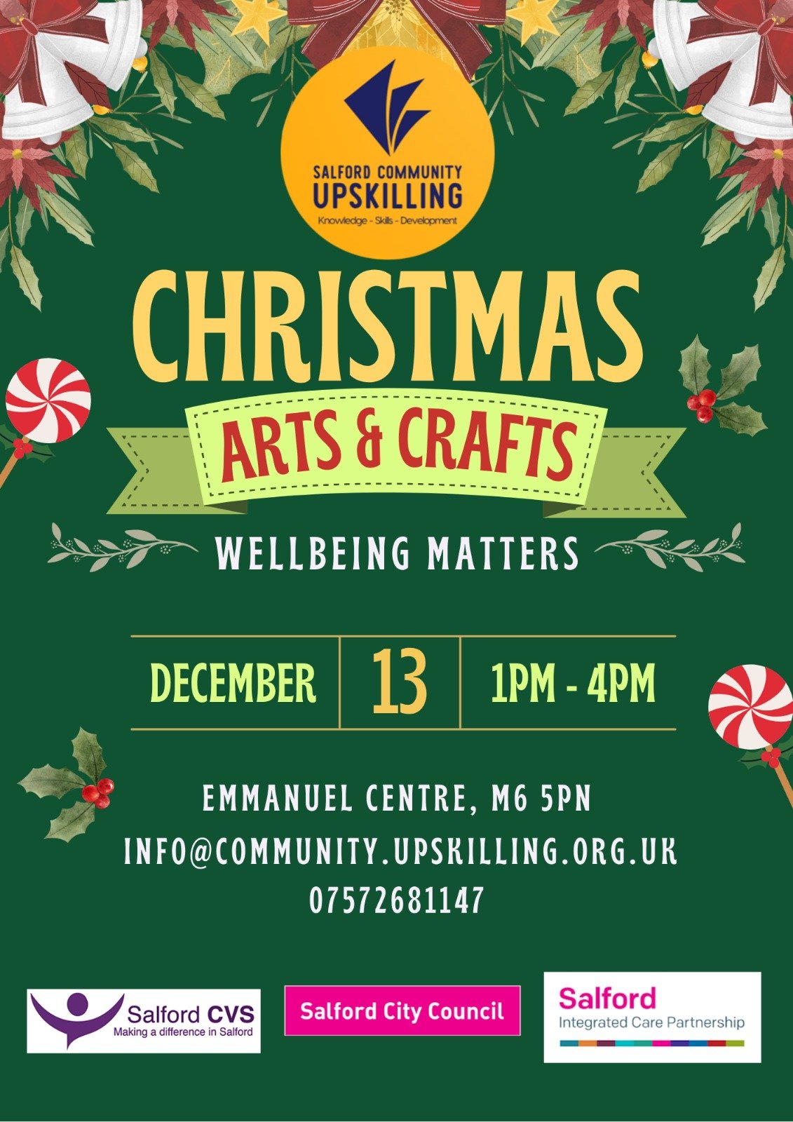 As part of our “Wellbeing Matters” series, come make your own festive decor on December 13th (2–4 pm) at the Emmanuel Centre (M6 5PN).